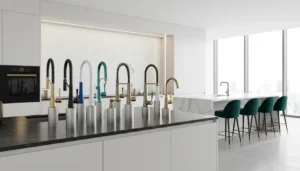 Metaliczne akcenty to jeden z kluczowych trendów 2025 roku. Koniec z wszechobecnym chromem – teraz dominują szczotkowane wykończenia w kolorze złota, miedzi, stali lub gunmetal (ciemna, grafitowa stal). Te eleganckie detale pojawiają się nie tylko na armaturze, ale również na uchwytach meblowych, ramach luster, oprawach lamp czy profilach kabin prysznicowych.