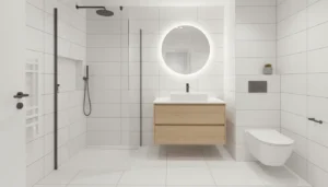 - Białe meble i płytki — klasyczny kontrast, który nigdy nie wychodzi z mody. Czarna bateria na tle białych powierzchni staje się punktem centralnym aranżacji.